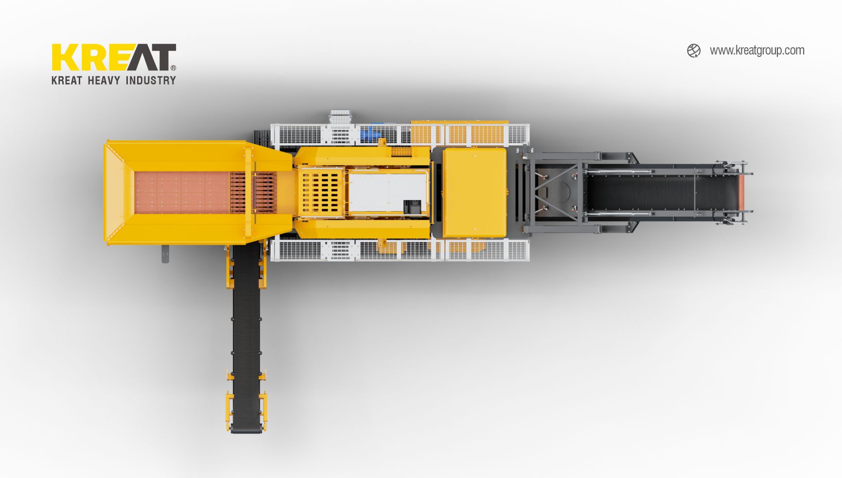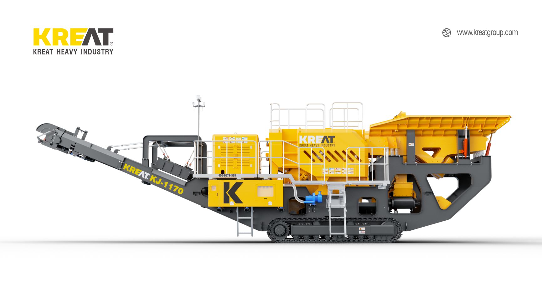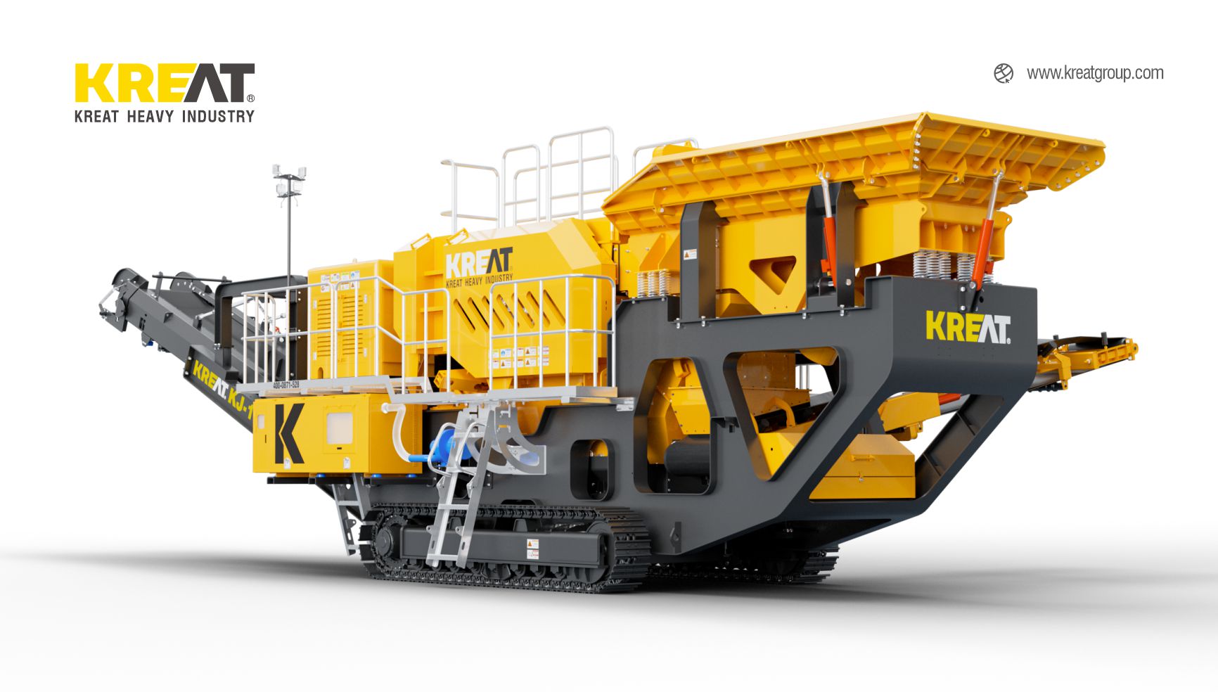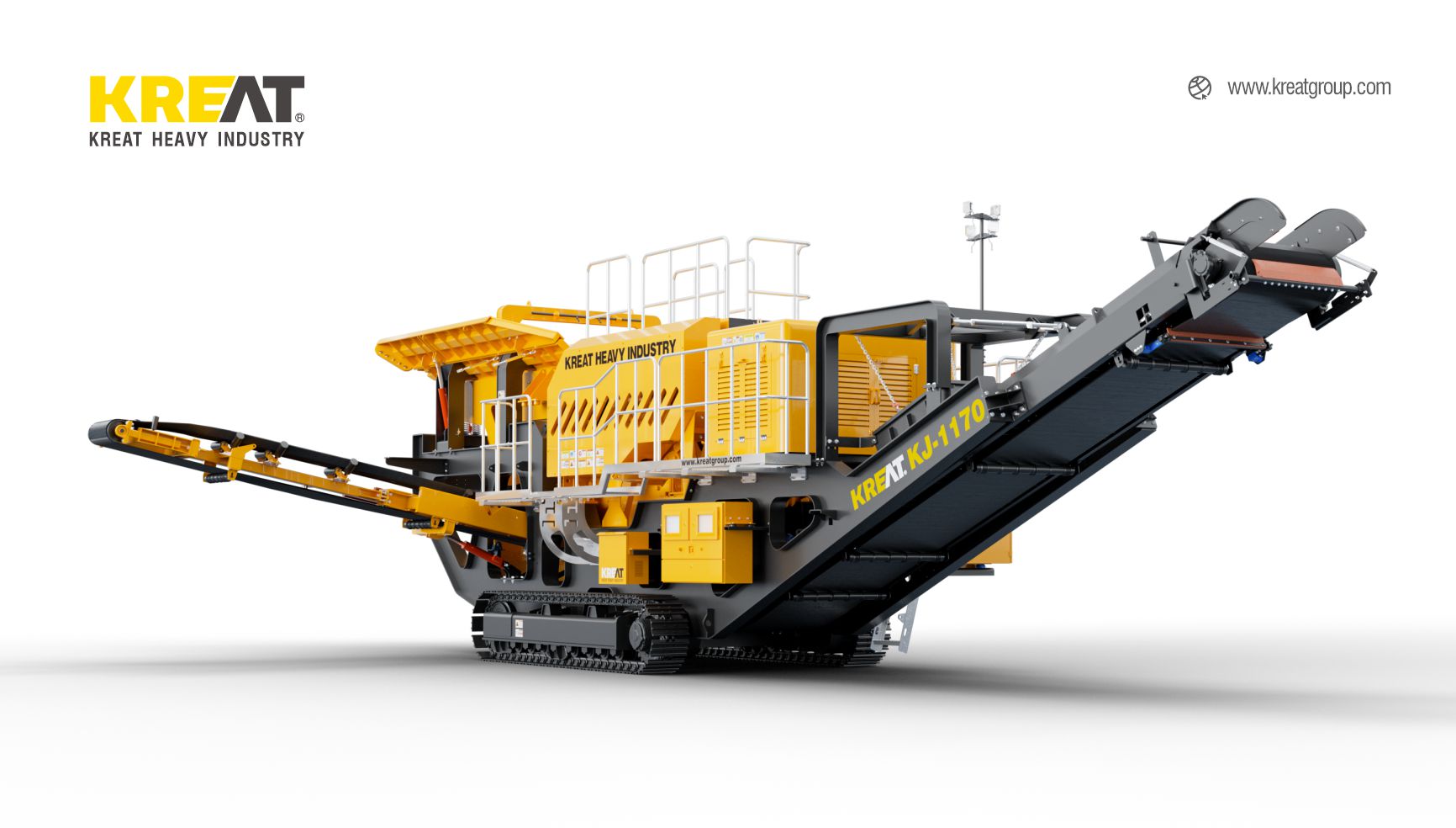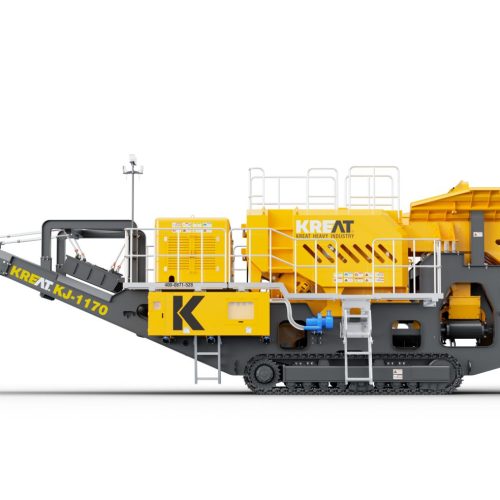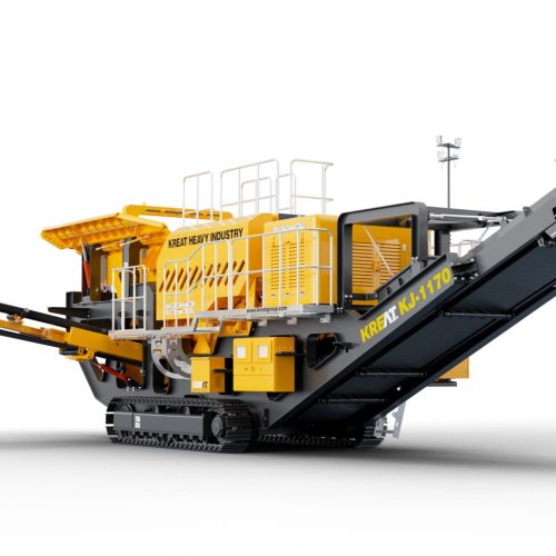 KREAT Tracks mobile jaw crusher KJ-1170 is mainly used for coarse crushing. After the material enters the feeder, the small particles screened out enter the sorting hopper for material classification. The large particles of material enter the crushing machine for squeezing and crushing, and are stacked by a belt conveyor. The crushing of construction waste or materials containing iron is